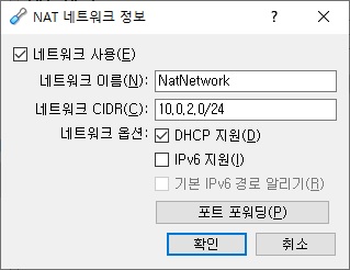더블클릭해보면 생성된 NAT 네트워크 정보 볼수 있음 (수정해도 되고 그냥 사용해도 됨)